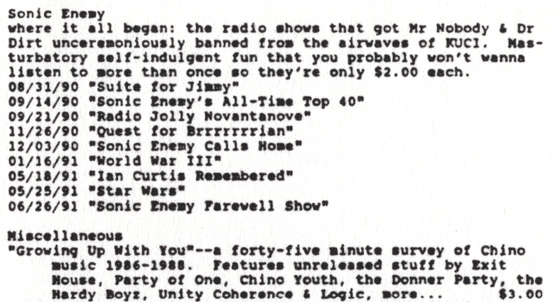There are many highlights from the catalogs, chief among them its listing of radio show tapes: Sonic Enemy was also the name of Peter's radio show on KUCI, hosted by Mr. Nobody (Peter) and Dr. Dirt (Peter's friend Greg). If you have literally any surviving audio from this radio show, please, please, please, please, I beg you, get in touch. The episodes are visible in this section of the scan directly below (w/ "Growing Up With You" listing as a map landmark):