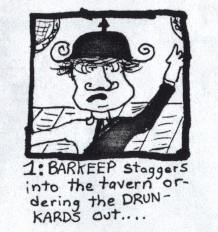 | BARKEEP: Patrons, oh patrons, you must clear out! Drop that tankard! Stop up the alcoholic spout! We must run! We must flee, flee for our lives, time grows short! None remains for any retorts! | |
