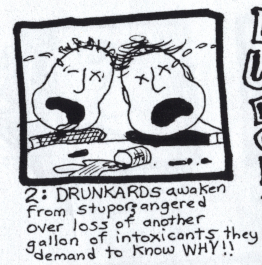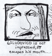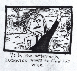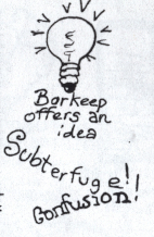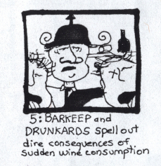 | BARKEEP: Yes, of course, but. But. DRUNKARDS: A sudden glass of wine would be a shock! A sudden glass of wine could be death! BARKEEP: Listen to me, patrons, Ludovico, we do care for your welfare, we do so very much indeed, why, listen to those consequences. To, to, so suddenly drain a glassful, could--- DRUNKARDS: You could succumb to spasms and fits! Your fingers could fall off slowly in bits! BARKEEP: On the house! I will bring you a flagon of ein honey mead! I will fetch you a fine darkish ale! Anything to spare you the fearsome shock of a sudden drop of wine! Yes, oh, yes--- LUDOVICO: I'm beginning to think there's no wine here to drink! BARKEEP: Absurdity! Laughability! I assure you we have, securely hidden against a rush of wine-thirsty humanity, a fine web-encrusted bottle from the empire's finest estate. Ah, please... allow me to fetch it... DRUNKARDS: Ah but you need help! Such a precious bottle can't have too many hands holding it. BARKEEP: Yes, yes, of course. Ahh. The slightest jolt could shatter it. Your help is most appreciated, patrons. Now, now, f-f-f-follow me, to th... LUDOVICO: Worms! Enough of your lies! Enough of your dread! It is plain to me, wine from this place has fled. DRUNKARDS: No, no, what you say isn't true, Please, allow us, to-- LUDOVICO: Enough! |