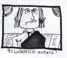 DRUNKARDS: Doom, doom!! BARKEEP: We, we will turn his head, we will befuddle and confuse him---Ah.... Ludovico, welcome to my unworthy tavern... |