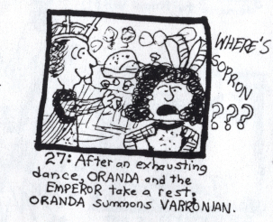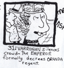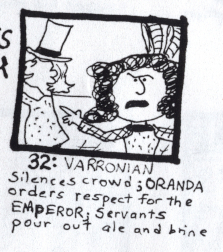 VARRONIAN: I assure you, Oranda, he will be here soon, according to a guard at the gate. ORANDA: Good. May I suggest---oh, sire, you spy a busty chest, to the dance floor with your latest imperial conquest, for I think the orchestra is about to commence another song. EMPEROR: Busty chest? Where? Oh my! My! My! ORANDA: ...Good, now we may continue without buffoonery's interference. You say Sopron has already entered the palace? VARRONIAN: Yes, quite some time ago. He was at once put into a lackey's uniform. ORANDA: Good. The border barbarians can commence immediate attack. When they invest our civilized land, that will be the emperor's knell. Then, together, Varronian, we will stem the brute at the city's gates. A grateful populace will give us the throne. VARRONIAN: Oh yes, and a crown upon our heads. ORANDA: This certainly will show I faithfully executed his orders, though with a proper amount of reluctance for all the nobles to see. |