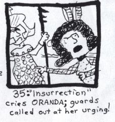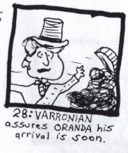 ORANDA: I will not be seen to be pleased outwardly when Sopron stoops to sweep, and to hold that vomitous black bowl. VARRONIAN: Look! So appears Sopron. SOPRON: I bring the proper dustpan. ORANDA: Poor, unfortunate man. If only I could rescind these vile edicts. SOPRON: What, and ruin your conquest of the empire? ORANDA: Regards on your piercing vision. VARRONIAN: Pierce? Ignorance demands bitterness. Ignore it. |