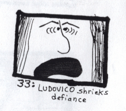 LUDOVICO: I have come to fulfill my journey. I am not a noble, I am... Ludovico! CROWD: LUDOVICO! LUDOVICO: I will not leave this palace until one sees wine again in imperial goblets, and the empire without tormented authority. Oranda, I will set you to flight! CROWD: Yes, Ludovico! Destroy her! Destroy! Bring it forth! ORANDA: Sire, insurrection is within our midst! Call out the guards! EMPEROR: Oh, well. ...Insurrection!? Oh! Oh yes. Oranda, do, do whatever you think best, what, whatever that is. ORANDA: Arrest Ludovico, and Sopron the floor-sweep! |