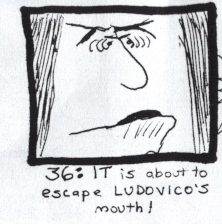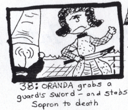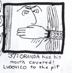 LUDOVICO: The noonday sun must scorch this venomous swatch of -- I feel it rising with tremendous fury! It's beyond control! My proclamation is--- ORANDA: Cover his mouth! Take this re-sheathed sword and cast him into the pit. |