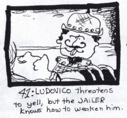 LUDOVICO: That lustful jailer would be more than a match for me in this shape. And the savages... JAILER: The barbarians....... they hold......... the city....................................... QUELLNINA: There's truth in your words! LUDOVICO: Sire...! Time runs out! |