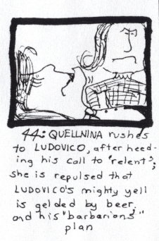 QUELLNINA: The shrieking and pillage at the city gates! The truculents! The savage--- AaaaAaaAAAaah! The savages! JAILER: The savage has not seen these gates in 300 years! How, how---I do hear them! Heavens! We must teach them to tremble and obey! QUELLNINA: Your help is needed now! Death to the invader! JAILER: Oh! Death to the invader!!.... QUELLNINA: ...There, impostor, he's gone. Your scheme was successful, liar. LUDOVICO: What I say is true. QUELLNINA: You're a great spinner of tales. LUDOVICO: I speak the truth! QUELLNINA: You do not. You're not the Ludovico I know. A call went around the sun and made darkness eternal. But as long as Ludovico was in the empire, a defiant dusk remained. But I guess he's not come and will never arrive, the Ludovico who answered rage with mirth, and would barely notice the feted slaps of a jailer. Where is he? Do you know? Oh, perhaps you are Oranda in disguise again? Come here to bedevil me? LUDOVICO: You knew I was coming? QUELLNINA: For wine? Do fish swim in the sea? LUDOVICO: Then you must know the truth! I am here to restore wine! I am here to free both your majestys from Oranda's yoke! My shout is thunderous. It's true that ale produces an unpleasant fate! It binds, it gelds. I can't help. I have no power... |