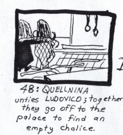QUELLNINA: Then get up! I'll untie you! The barbarians will soon be here in the pit. LUDOVICO: Grainy swill renders me weak. It's exertion enough to speak... QUELLNINA: Then let me help you. LUDOVICO: Only one thing will help. An empty wine chalice... the absence of wine in its natural home will snap beery chains... QUELLNINA: Not a single chalice remains in the palace! LUDOVICO: Help me up. Together we must find one, and it must be soon... |