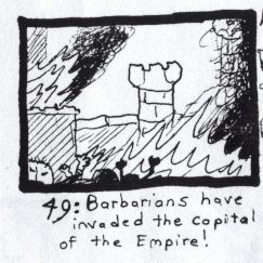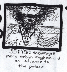 JEHO: Baboons! Why isn't the city on fire? BARBARIANS: But Jeho, we--- JEHO: Baboons! You want to keep the choicest chunks of flesh for yourselves! How dare you! I'll take this sword and strike you all down! |