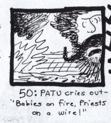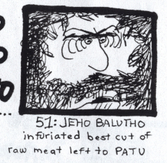 PATU: Light your torches! Join the porches! There are huddled babies ready for dungeon scorches! BARBARIANS: Baby flesh! Baby flesh! PATU: Roll them up in mashes! Roast their heads and broil their arms! BARBARIANS: Jeho! Jeho! Jeho! PATU: Ah, Jeho's coming! What a fine meaty fest is ready! |