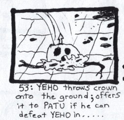 JEHO: Patu, on the ground now you are. Ahh, a fine white chalice, just grabbed out of the emperor's house. Here, Patu, have your crown. I call you now, Chieftain of Chalices, as I slap this crown on your head. ...Oh, perfect fit. Now, go, traitor. If I see you again, I kill you. BARBARIANS: Jeho! Jeho! Jeho! |