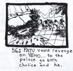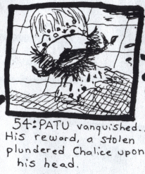 | PATU: At last I can rise from the street. Uhh. I must be getting to the palace upon Jeho... I must revenge myself... there will be Jeho's.... this chalice must get there, must... | |