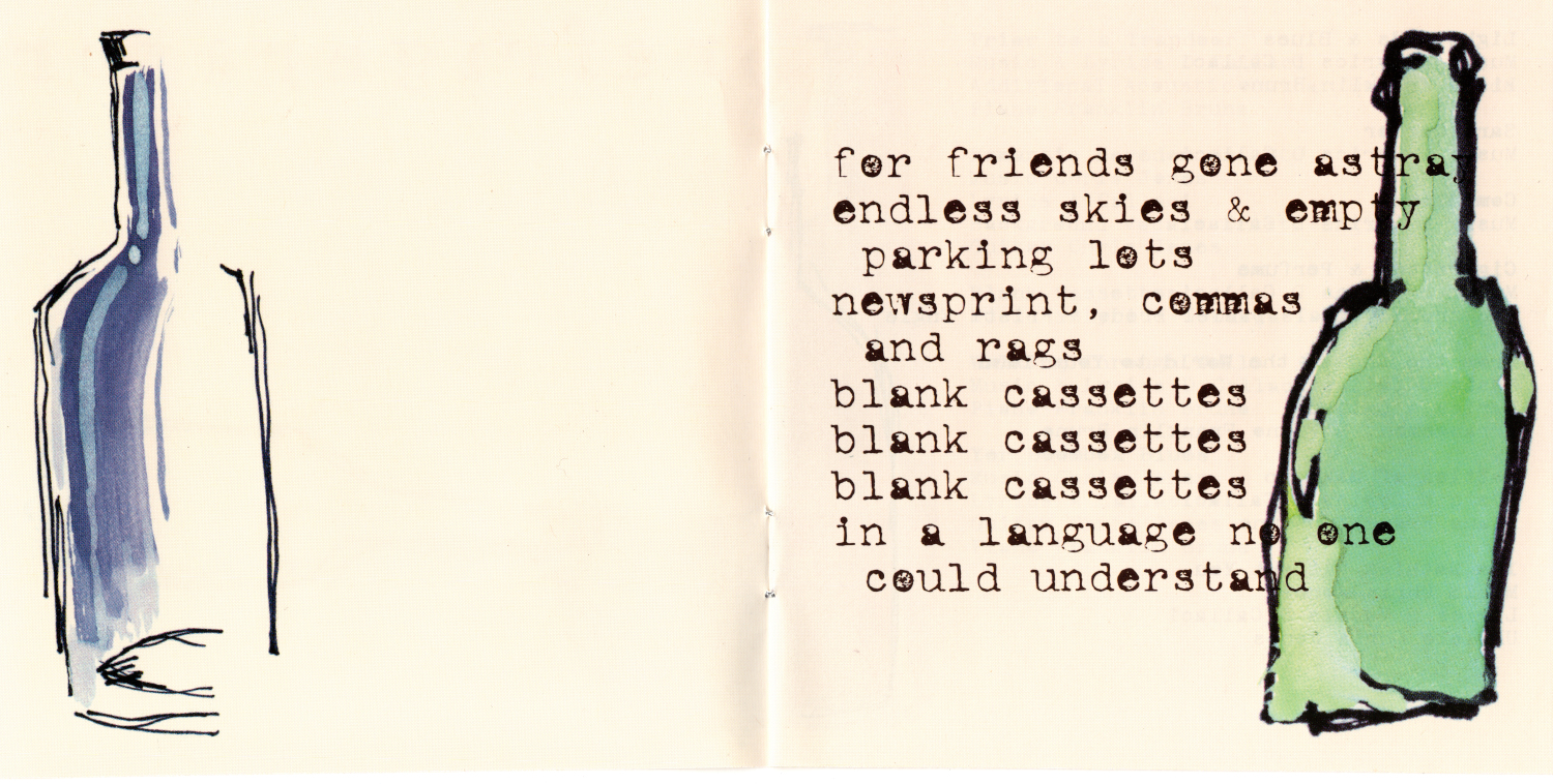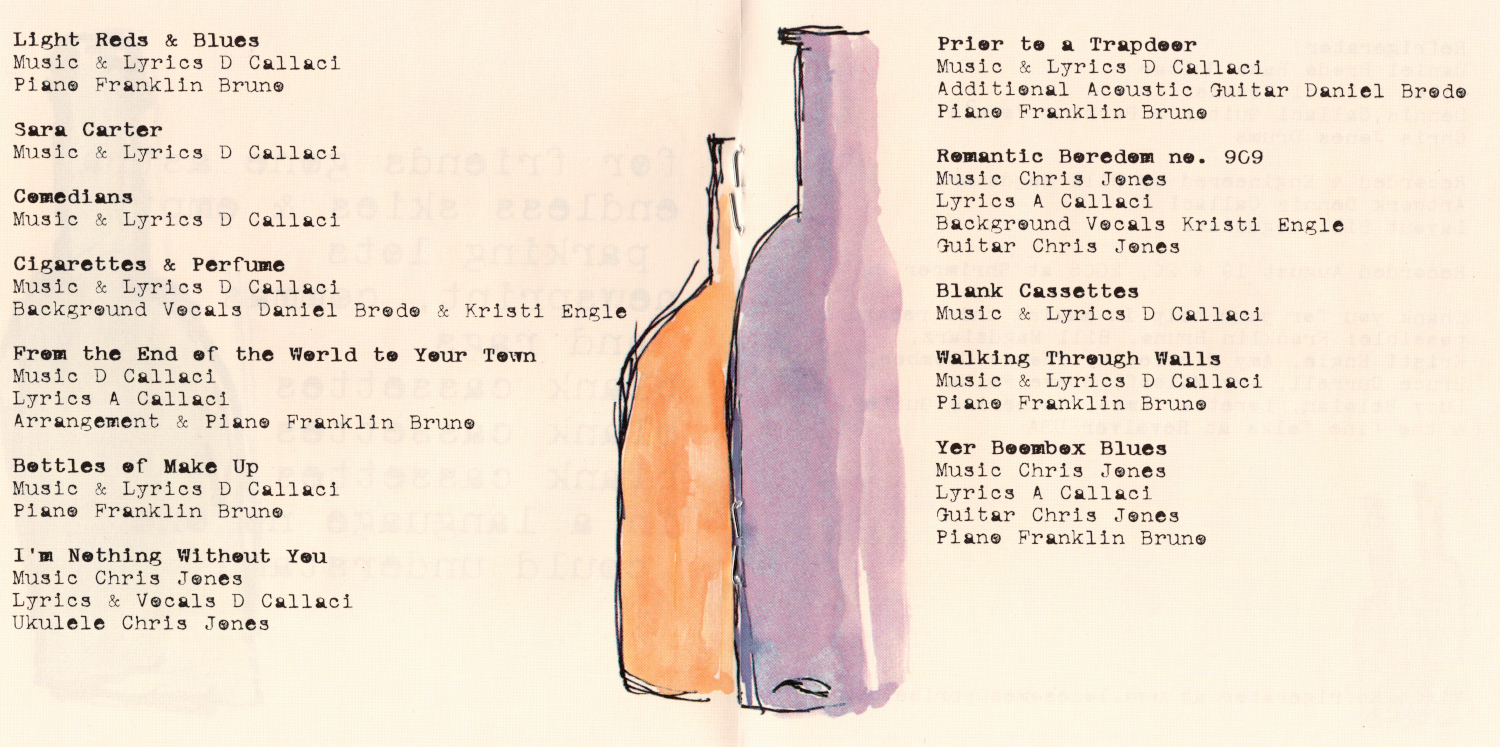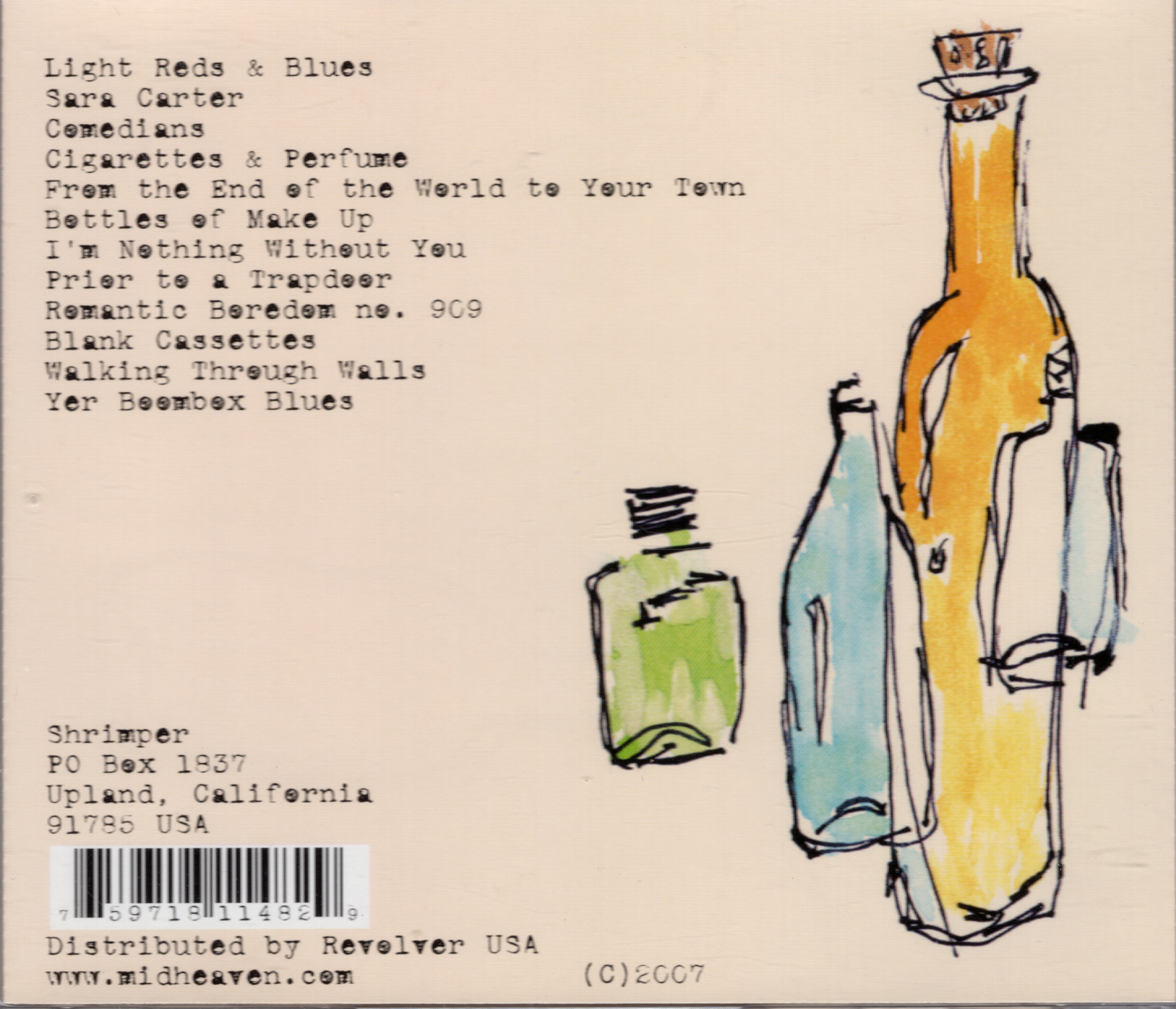 This is a nice album. They turn off the electric for awhile here, and Franklin's on piano all over it, so you can just settle in. Like Glitter Jazz, this one's pretty cohesive in its sound, so there isn't a lot to say about the flow of things. "Light Reds and Blues" is a beautiful intro, and after about 55 seconds you start getting Franklin's piano chords underneath everything, which is what promotes it to a "one for the Greatest Hits" entry. From there, it's more beautiful stuff, pretty steady. "Blank Cassettes" has Dennis and Allen singing in step the whole way through, which is always just the best. Chris Jones is on guitar for two tracks ("Prior to a Trapdoor" and "Yer Boombox Blues") and ukelele on one ("I'm Nothing Without You"). You can also hear Kristi Engle, formerly of Massengil but delivering some obviously very different vocal stylings here, on backing vocals on 'Cigarettes & Perfume' and 'Romantic Boredom no. 909'. Pick this CD up at Grapefruit or Revolver using the buttons above.