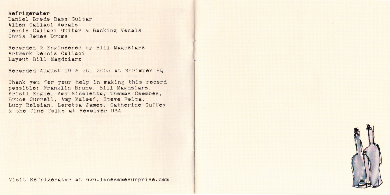 Refrigerator - Daniel Brodo Bass Guitar, Allen Callaci Vocals, Dennis Callaci Guitar & Backing Vocals, Chris Jones Drums. Recorded & Engineered by Bill Magdziarz. Artwork Dennis Callaci. Layout Bill Magdziarz. Recorded August 19 & 20, 2005 at Shrimper HQ. Thank you for your help in making this record possible - Franklin Bruno, Bill Magdziarz, Kristi Engle, Amy Nicoletta, Thomas Coombes, Bruce Currell, Amy Maloof, Steve Folta, Lucy Beloian, Loretta James, Catherine Guffey, & the fine folks at Revolver USA.